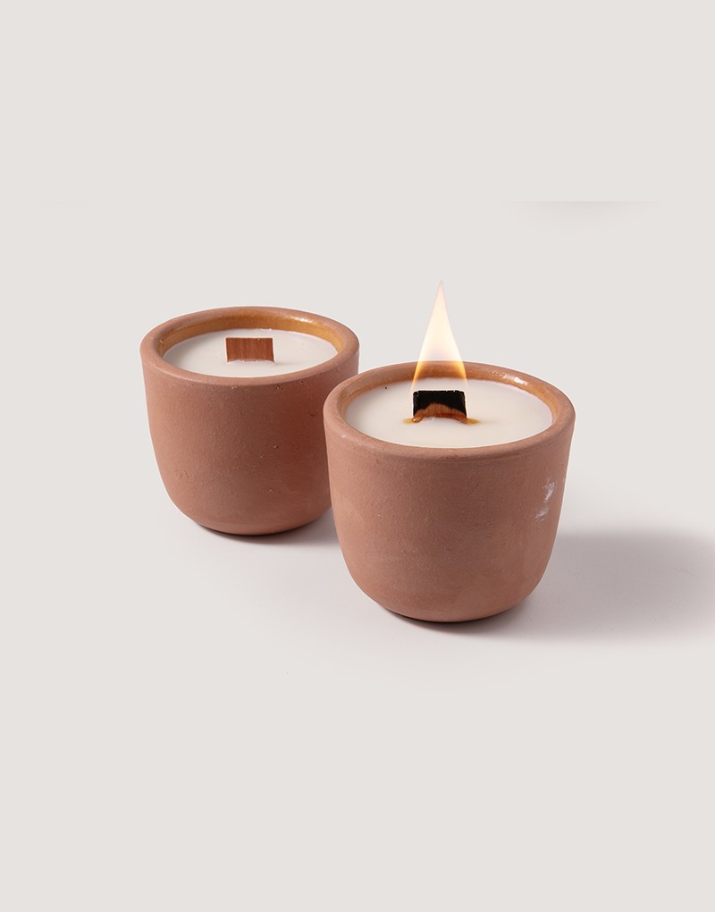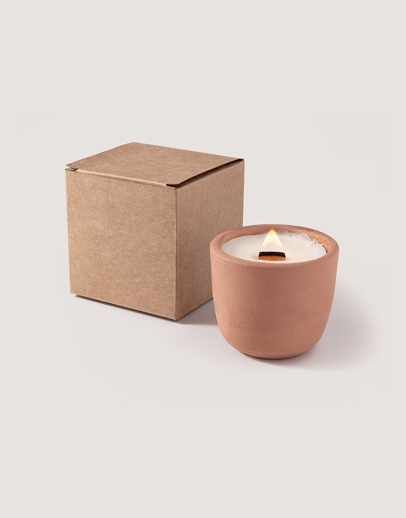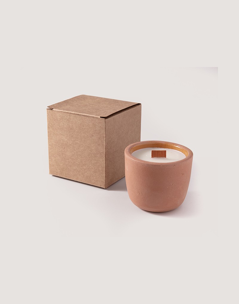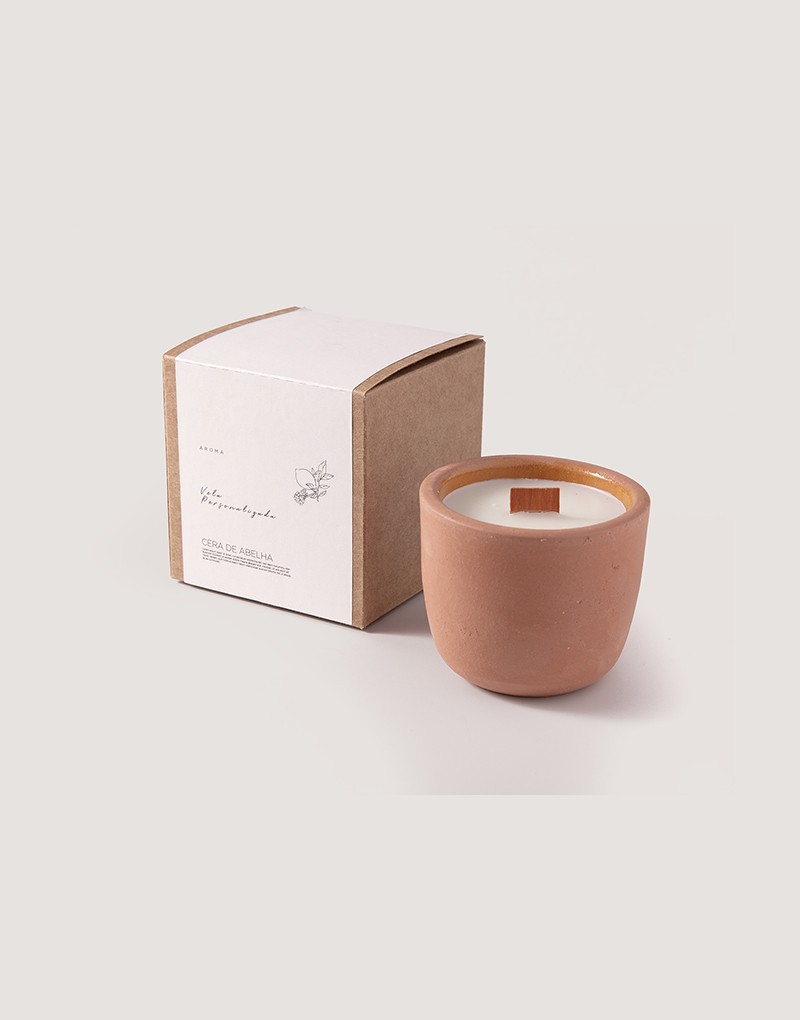 Vela de cera branca em copo de barro, pavio de lasca de madeira. embalagem: caixa em papel kraft natural 350g c/ adesivo customizável.