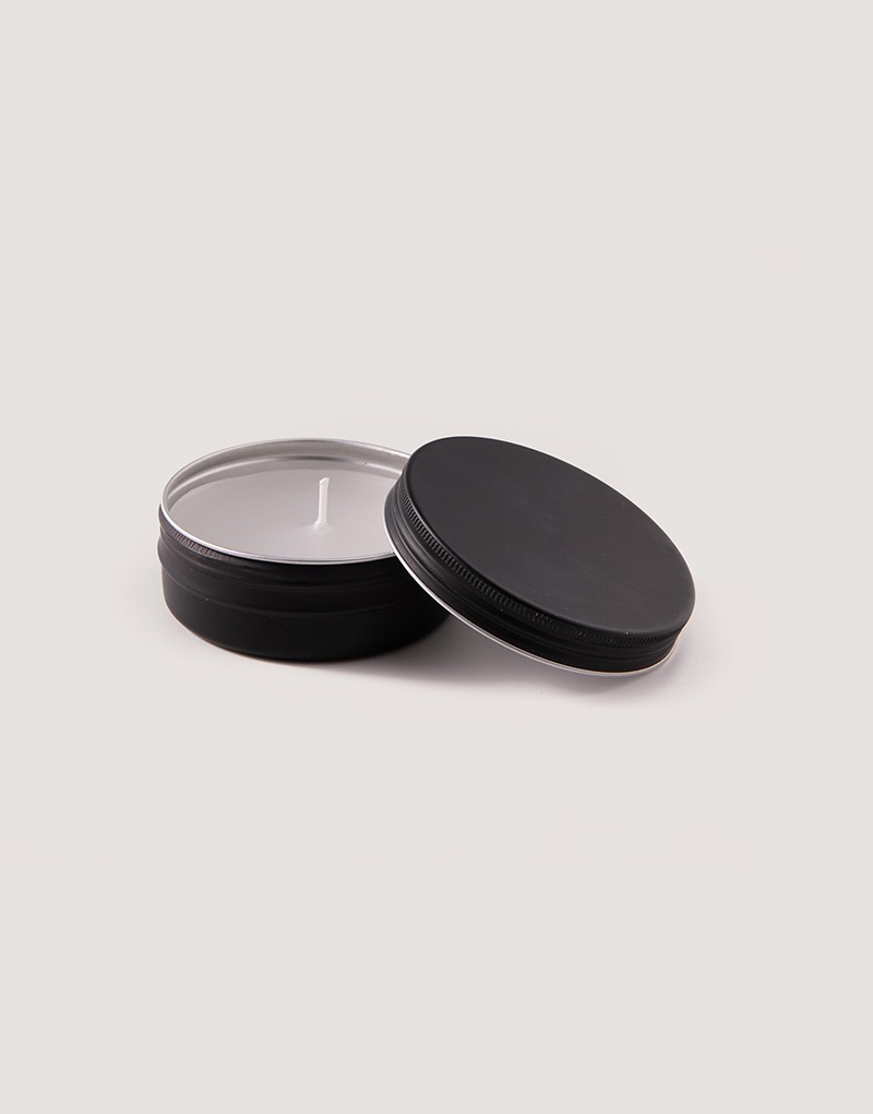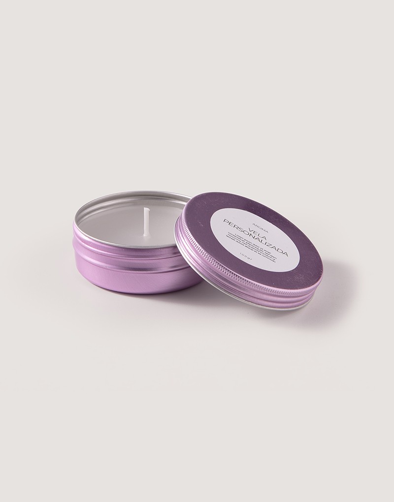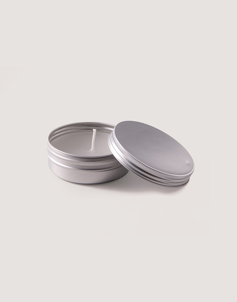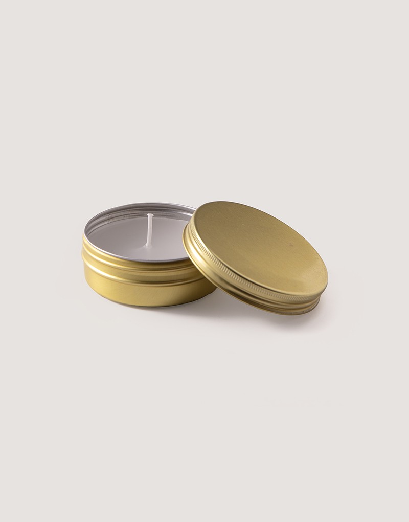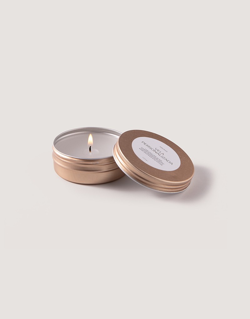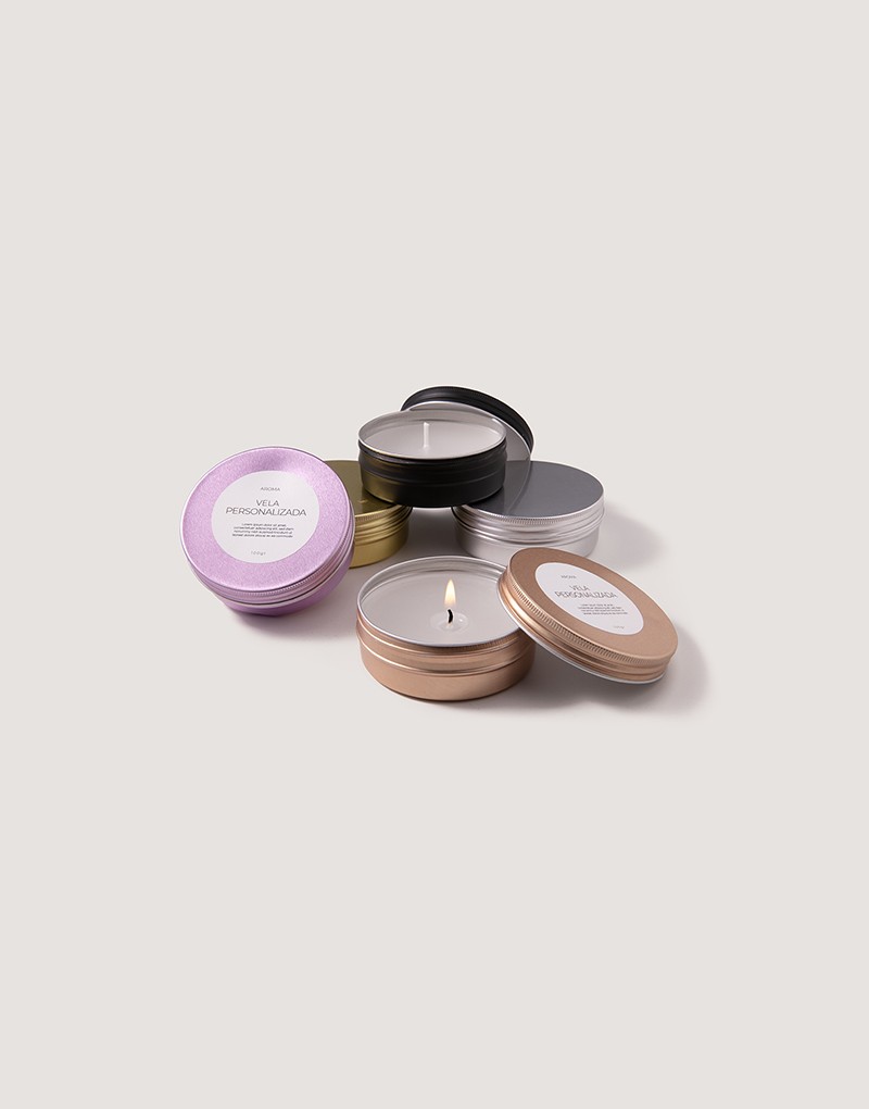 Vela de cera branca em lata de alumínio, acabamento metalizado. tampa de rosquear. rótulo adesivo customizável.
